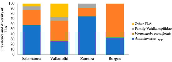 In Salamanca, a prevalence of 100% (57/57) was obtained, with the genus Acanthamoeba predominating with 57.90% (33/57). The species V. vermiformis was present in 29.82% (17/57) and amoebae of the family Vahlkampfiidae in 7.01% (4/57). However, other FLA were identified in 5.26% (3/57). Other FLA are those amoebae that are difficult to identify by a morphological approach.