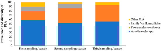 This variability observed throughout the three sampling periods can corroborate previous studies described by Bass and Bischoff [], which show that the abundance and diversity of FLA in the environment depend on season, temperature, humidity, rainfall, pH, and nutrient availability. Furthermore, they have pointed out that amoeba diversity can increase during transitional seasons such as autumn due to optimal combinations of temperature and humidity. However, in winter, diversity tends to be lower as only species resistant to low temperatures or able to form cysts remain active. In contrast, our research showed a small increase in diversity, with new species of FLA being recorded due to increased humidity due to winter precipitation []. In fact, a study conducted at a tourist resort ‘Hierve el Agua’ in Oaxaca, Mexico, found a higher number of FLA species during the rainy season compared to the dry season [].