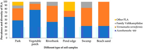 Overall, of all the amoebae cultivated and monitored at 26 °C, Acanthamoeba spp. was the most frequently found amoeba in all soil types, followed by V. vermiformis. The presence of family Vahlkampfiidae and other FLA varied according to the environment, being more frequent in dry soils such as parks, vegetable patches, and other samples.