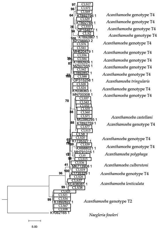 Maximum likelihood phylogenetic tree of the genus Acanthamoeba obtained based on the 18S rRNA gene analysis (1.311 nucleotide positions), showing the position of each isolate obtained in this study that is marked within the boxes. The tree is rooted with Naegleria fowleri as the outgroup. The percentage of replicate trees, in which the associated taxa are clustered together in the bootstrap test, is shown next to the branches (in bold). Scale bar = 5.00 substitutions/site.