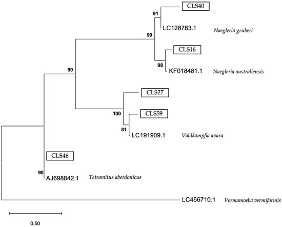 Maximum likelihood phylogenetic tree of the family Vahlkampfiidae obtained based on the internal transcribed sequences (ITS1 and ITS2 regions) and 5.8S sequence (625 nucleotide positions), showing the position of each isolate obtained in this study that is marked within boxes. The tree is rooted with Vermamoeba vermiformis as the outgroup. The percentage of replicate trees, in which the associated taxa are clustered together in the bootstrap test, is shown next to the branches (in bold). Scale bar = 0.50 substitutions/site.