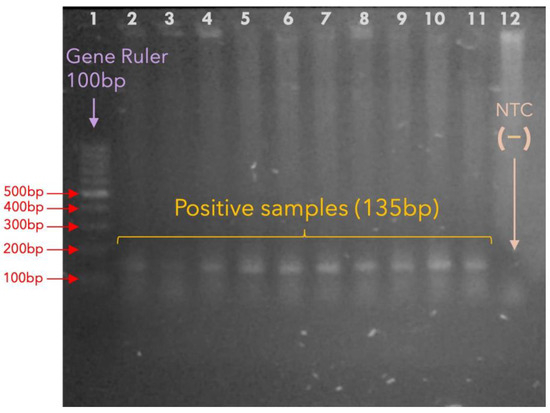 Molecular detection of TPA. The figure shows a set of TPA-positive samples, with the correct amplification of the Tpn47 gene via nested PCR (135 bp). Lane 1: Gene Ruler of 100 bp; the most prominent band corresponds to 500 bp. Lanes 2–11: Tpn47-positive samples as indicated by the bands between the 100 and 200 bp bands of the gene ruler. Lane 12: NTC, no-template control (sterile water). The 15 positive samples were used to estimate the molecular prevalence of TPA.