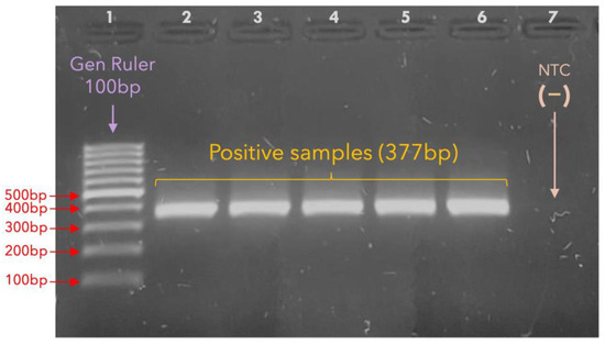 Amplification of the 23S rRNA gene. The agarose gel shows TPA-positive samples with the successful amplification of the 23S rRNA gene via nested PCR (377 bp). Lane 1: Gene Ruler of 100 bp. Lanes 2–6: 23S positive samples, as indicated by the bands between the 300 and 400 bp bands of the gene ruler. Lane 7: NTC, no-template control (sterile water). The 23S rRNA was amplified from all the TPA-positive samples, and they were subsequently purified.