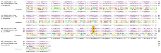 Aligned sequence with the A2058G mutation. Samples from 11 participants were sequenced after purification, and through bioinformatic analysis, sample 76 from CAPASITS was determined to have azithromycin genetic resistance (punctual mutation A2058G). The alignment first shows the SS14 T. pallidum strain (NR_076531.1_SS14/1-2947) with the A2058G mutation, followed by the Nichols strain (wild type, NR_076156.1_Nichols/1-2947), which was used as a reference, and finally, the sequence obtained from the 76 CAPASITS samples (7_merged/1-386, SUB14527389 T_PALLIDUM_PALLIDUM_MEX, PP961320). Between positions 242 and 362 (as shown at the sequence edges), the A2058G punctual mutation cab be observed (highlighted in the yellow box on the sequence). A substitution of an adenine “A” (in green) by a guanine “G” (in red) is evident. This latter base (G) indicates the presence of the mutation.