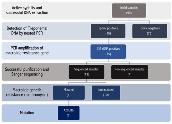 Flowchart of the study samples. Ninety samples were included in the study; for fifteen samples, the Tpn47 gene was correctly amplified, and the 23S rRNA gene was amplified from all the samples. Only 11 samples reached the concentration necessary to enable sequencing. One sample presented the A2058G mutation of azithromycin genotypic resistance.