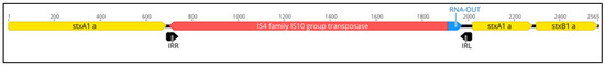 Genomic region of the stx1a operon of strain BfR-EC-18115 showing the integration of an insertion element into the stxA1a subunit gene (yellow: stx1a subunit genes, red: transposase, blue: non-coding RNA, black: inverted repeats, numbers represent base pairs [bp]).