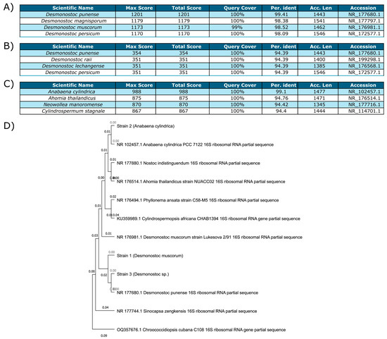Each table shows the four top results for analysis through BlastN in each strain. Queries were run against the rRNA/ITS database through a discontiguous megablast. (A) Strain 1 (Desmonostoc muscorum (UTAD_N213)); (B) Strain 3 (Desmonostoc sp.); (C) Strain 2 (Anabaena cylindrica (PCC 7122)); (D) Maximum likelihood phylogenetic tree of the three strains, their closest relatives and two less closely related anchor species.