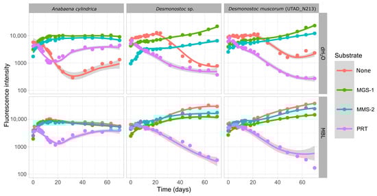 The growth of each cyanobacterium was monitored through the measurement of the fluorescence intensity measurements using a TECAN Infinite® M Nano + plate reader (Männedorf, Switzerland) Measurements were programmed with 20 s of prior shaking in orbital mode with a 1 mm amplitude and a frequency of 432 rpm. After shaking, the cyanobacteria were excited at a wavelength of 620 nm and the emission intensity was measured at 685 nm, with 4 measurements taken for each well. The absorption at 620 nm corresponds to the maximum absorption peak for phycocyanin, the principal cyanobacterial-specific pigment in the antennae of blue-green cyanobacteria like Nostoc [23,51]. The results were transferred to an Excel spreadsheet for further analysis and subsequent graphing using R version 4.3.2.