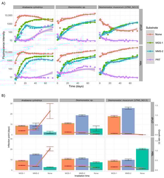 In both Desmonostoc species MGS-1 and MMS-2 behaved similarly, with MGS-1 leading to slightly faster growth than MMS-2. Cultures grown in growth medium also grew faster than those in dH2O in both cases, although these differences were not as noticeable in Desmonostoc sp., which further cements it as the more resilient of the two. Parametric analysis (Figure 3B) further supports this. MMS-2 consistently displayed higher inflection points and lower growth rates, both consistent with subpar growth. This was more noticeable in dH2O than in MBL.