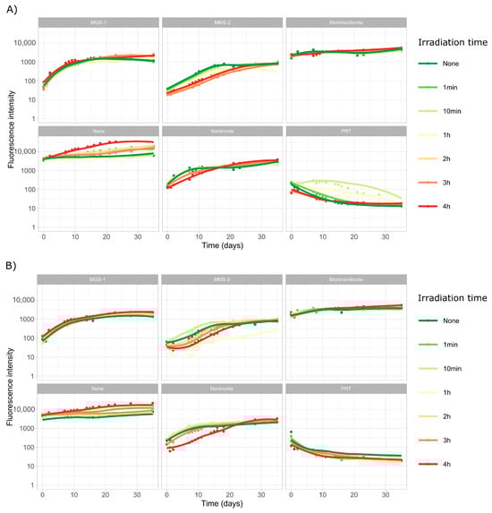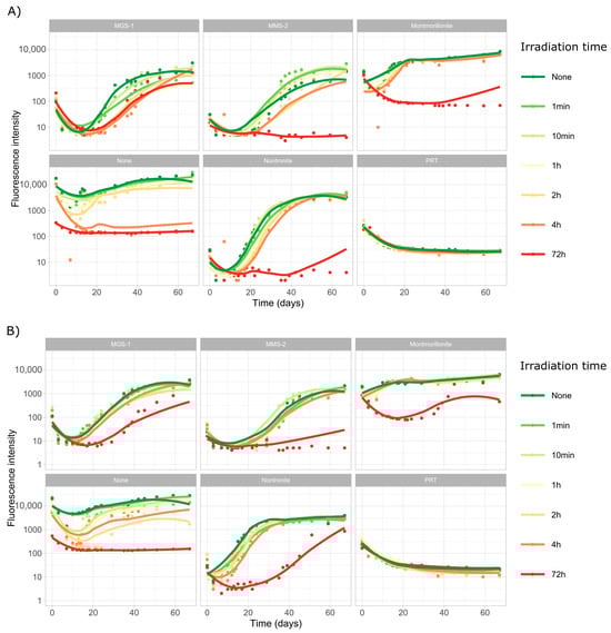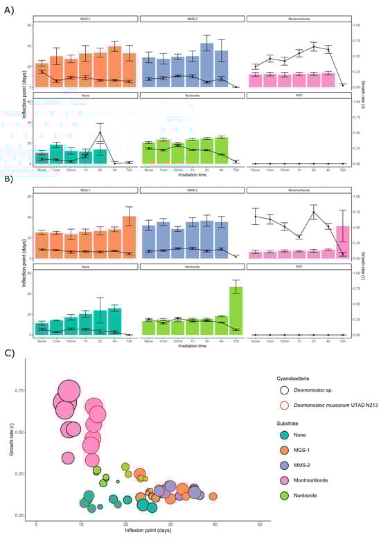 In irradiated but not desiccated samples (Figure 5 and Figure 6) most of the previously observed patterns were conserved, although growth was faster, growth rates were higher and inflection points were shorter. Some changes could also be observed, as nontronite and MGS-1 behaved similarly before desiccation, but nontronite clearly outperformed MGS-1 after desiccation, suggesting that its moisture-retaining properties can be relevant in desiccated samples. MGS-1 and MMS-2 also showed similar results following desiccation, but MGS-1 overperformed compared to MMS-2 in solution, likely because of damaging oxidative compounds present within MMS-2. Of the two cyanobacteria, Desmonostoc sp. consistently grew faster, which suggests that significant differences may exist even between very genetically close strains.