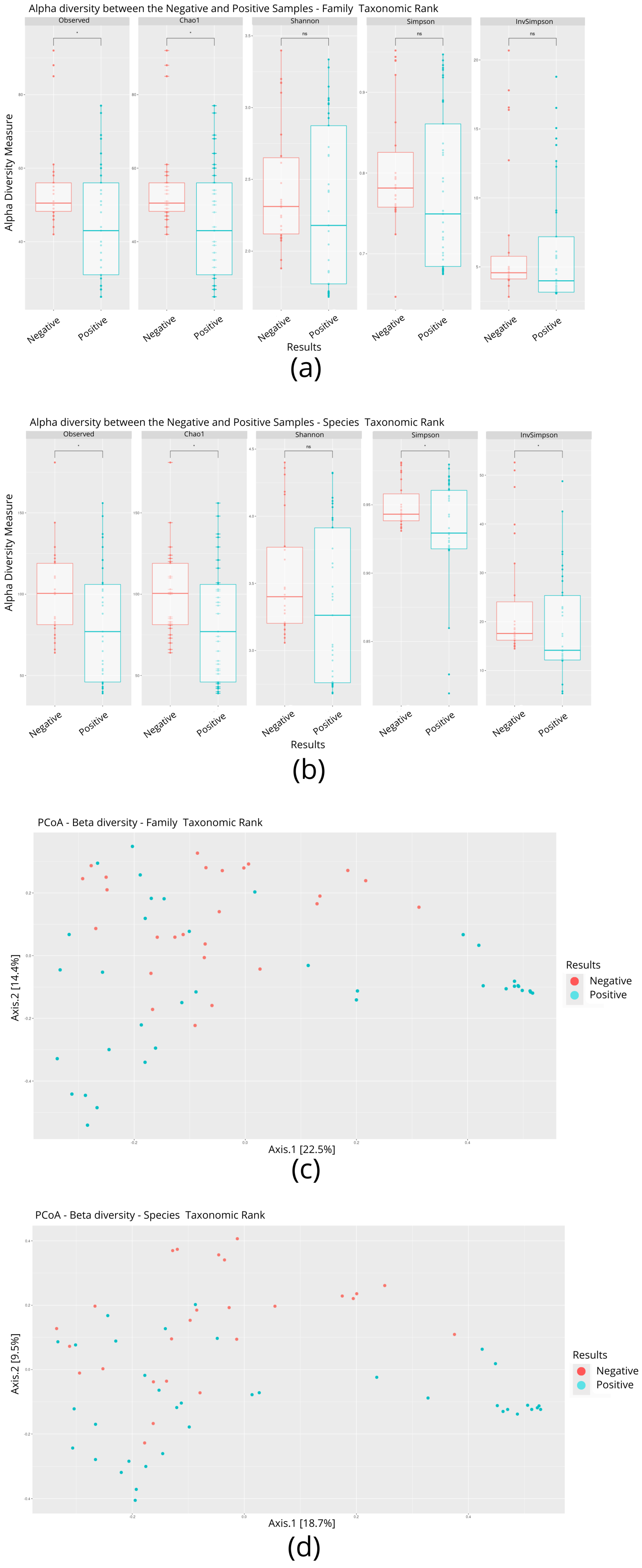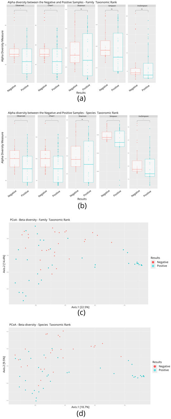 Comparison of alpha and beta diversity parameters between individuals infected and not infected with SARS-CoV-2. (a) Boxplot graphs of alpha diversity indices at the family level. (b) Boxplot graphs of alpha diversity indices at the species level. A p-value < 0.05 is represented by an asterisk (*). (c) Analysis of beta diversity at the family level. (d) Analysis of beta diversity at the species level.