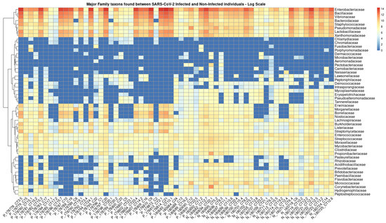 Heat map based on the numbers of reads of the main taxa that have changed in abundance between individuals infected (prefix P) and not infected (prefix N) by SARS-CoV-2. The clinical samples are listed in the bottom text line and the names of the bacterial families are shown in the text column on the left. The blue to red colored boxes represents the observed metagenomic sequencing reads (reads ranged from 0 to 14 on the logarithmic scale, respectively).
