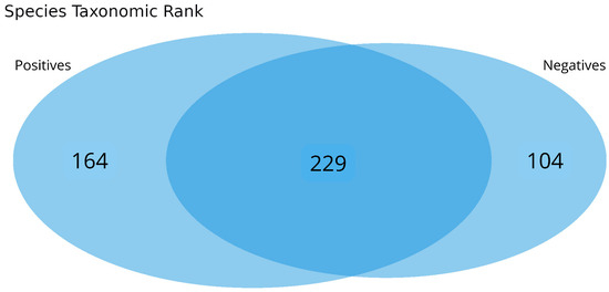 Alpha diversity was assessed for four age groups (age group 1: 18–31 years; age group 2: 32–45 years; age group 3: 46–59 years; and group 4: ≥60 years) and by gender (male: n = 29, 9 uninfected and 20 infected; female: n = 34, 17 uninfected and 17 infected) at both the family and species level. Figure 6 shows the results of alpha diversity at the taxonomic family level in terms of the absence or presence of SARS-CoV-2. A statistically significant difference (p < 0.05) was observed according to the nonparametric Wilcoxon test between age groups 1 and 2 in the Simpson and InvSimpson indices, and, when comparing the distribution graphs (boxplots) between positive and negative individuals, it was possible to identify a downward trend in microbial diversity for age group 2 (32–45 years).