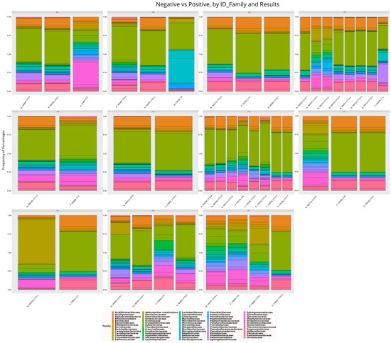 In order to describe the nasopharyngeal microbiome of members of the same household and compare it with that of other households, only households with at least one infected member and one uninfected member made up this analysis. Thus, of the total microbiomes analyzed, 42 belonged to individuals from 11 different households. It was observed that the composition of the bacterial community of the nasopharynx of the members of these households is similar, with a slight variation in abundance (Figure 5). In most cases, the greater the bacterial diversity, the lower the abundance of taxa in infected individuals.