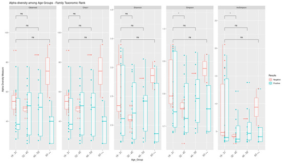 Comparison of alpha diversity parameters at family level among individuals infected with SARS-CoV-2 stratified by age group. Box–whisker plots of the alpha diversity indices and their comparison were generated from the results of the Wilcoxon test. The asterisk symbol (*) indicates significant (p < 0.05) and symbol (ns) indicates not significant.