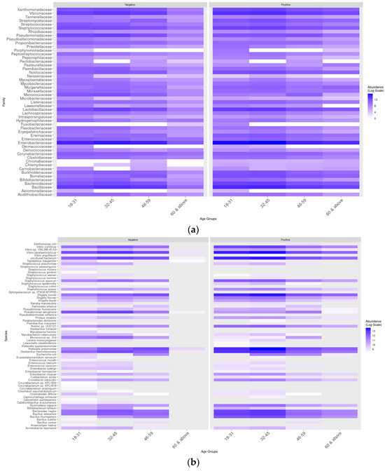 The distribution of the main taxa based on heat maps exposed a difference in their pattern of abundance (Figure 7). In age group 1 (18–31 years), the bacterial families Tannerellaceae, Streptococcaceae, Nostococcaceae, and Porphyromonadaceae were more abundant in infected individuals compared to uninfected ones (Figure 7a). On the other hand, the species Streptococcus parasanguinis, Streptococcus mutans, and Staphylococcus hominis were only present in uninfected individuals, and, curiously, Escherichia coli was not observed (Figure 7b). In contrast, Shigella sonnei, Klebsiella pneumoniae, Geobacillus thermoleovorans, and Vibrio parahemolyticus were enriched in the microbiomes of infected individuals (Figure 7b). In age group 2 (32–45 years), Shigella sonnei and Klebsiella pneumoniae were more abundant in the microbiomes of infected individuals, while Pseudomonas aeruginosa was less abundant. In age group 3 (46–59 years), the distribution of abundance and taxonomic diversity was similar between the groups of infected and uninfected individuals. In contrast, in age group 4, these parameters were markedly increased in infected individuals. In general, it was shown that some taxa were less abundant in age groups 3 and 4 compared to age groups 1 and 2, and Klebsiella pneumoniae was significantly more abundant in age group 2 compared to the others.