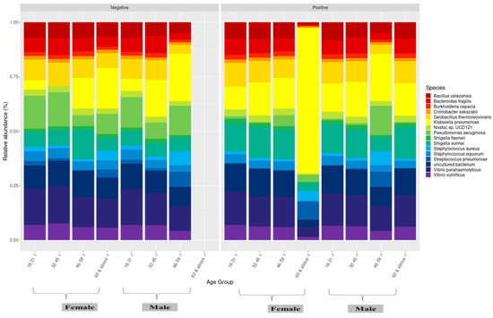 We also compared the nasopharyngeal microbiome of men and women infected and uninfected by SARS-CoV-2 between age groups. It was observed that Pseudomonas aeruginosa was more abundant among those not infected by SARS-CoV-2 and that Bacillus thuringiensis was more abundant among those infected by SARS-CoV-2 regardless of sex and age group. Among the younger population (18–31 years), no significant differences were observed regardless of sex. For women aged 32 to 45 years, Klebsiella pneumoniae was observed only in those infected by SARS-CoV-2. In the elderly infected >60 years, Klebsiella pneumoniae and Staphylococcus equorum were more abundant in women and Bacillus velezensis, Cronobacter sakazakii, and Bacteroides fragilis were more abundant in men in this age group (Figure 8).