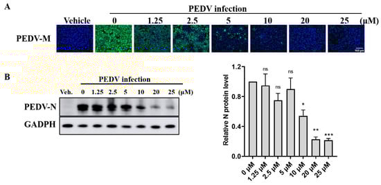 GS-441524 inhibits trypsin-independent PEDV proliferation in Vero cells in a dose-dependent manner. Vero cells were infected with PEDV DR13att and treated with 0, 1.25, 2.5, 5, 10, and 20 μM GS-441524. (A) Vero cells were fixed and subjected to immunofluorescent staining, using anti-PEDV M polyclonal antibody at 24 hpi. The cell nucleus was stained with DAPI. Images were representative of results obtained from three independent experiments. Scale bars = 100 μm. (B) The cells were collected at 30 hpi and lysed for Western Blot. The quantification of Western Blot was performed using the GAPDH/PEDV-N ratio. The experiment was performed three times independently. Differences were considered significant at (*) p < 0.05, (**) p < 0.01, (***) p < 0.001. ns indicates non-significance.