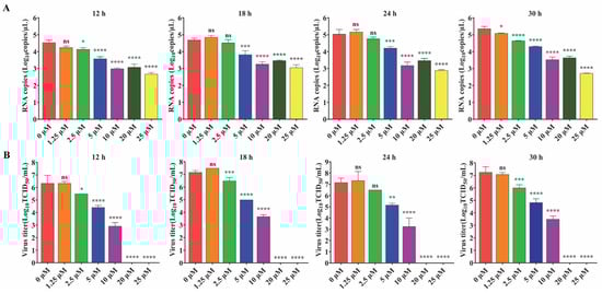 The effect of GS-441524 treatment on mRNA levels of PEDV M protein and PEDV titers at different time points. Vero cells were infected with trypsin-independent PEDV DR13att and treated with 0, 1.25, 2.5, 5, 10, 20, and 25 μM GS-441524. Supernatants were collected at 12, 18, 24, and 30 hpi for the determination of mRNA levels of M protein (A) and viral titer (TCID50) (B). Data are presented as the mean ± SEM of three independent experiments. Differences were considered significant at (*) p < 0.05, (**) p < 0.01, (***) p < 0.001, (****) p < 0.0001. ns indicates non-significance.