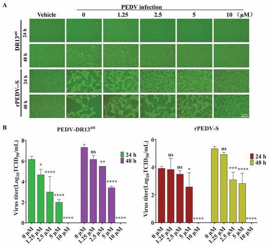 Comparison of the antiviral activity of GS-441524 against trypsin-dependent and -independent PEDVs. Vero cells were infected with DR13att (trypsin-independent) and rPEDV-S (trypsin-dependent), and then GS-441524 was added at 2 hpi to final concentrations of 0, 1.25, 2.5, 5, and 10 μM, respectively. At 24 hpi and 48 hpi, cytopathy was observed (A), and the virus titers in the supernatant were determined (B). Data are presented as the mean ± SEM of three independent experiments. Differences were considered significant at (*) p < 0.05, (**) p < 0.01, (***) p < 0.001, (****) p < 0.0001. ns indicates non-significance.