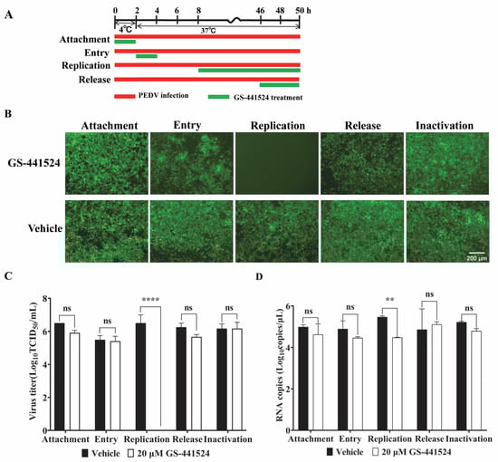 To assess the impact of GS-441524 on the life cycle of PEDV, Vero cells (1 × 105 cells/well) were seeded into 24-well plates and cultured until 90% confluence. Then, the Vero cells were treated with GS-441524 according to the following protocols. For attachment, the cells were incubated with rPEDV-∆ORF3-GFP (MOI 0.01) and 20 μM GS-441524 at 4 °C for 2 h. Then, the inoculum was removed, and the cells were cultured with fresh DMEM for another 48 h at 37 °C. For entry, the cells were infected with rPEDV-∆ORF3-GFP at MOI 0.01 at 4 °C for 2 h. Then, the inoculum was discarded, and the cells were treated with 20 μM GS-441524 at 37 °C for 2 h. After removing GS-441524, the cells were further cultured with fresh DMEM at 37 °C for 46 h. For replication, the cells were incubated with rPEDV-∆ORF3-GFP at MOI 0.01 at 4 °C for 2 h. After discarding the inoculum, the cells were cultured in fresh DMEM for another 6 h at 37 °C. Then, GS-441524 was added to the culture up to 20 μM and incubated for another 42 h. For release, the cells were infected with rPEDV-∆ORF3-GFP at MOI 0.01 at 4 °C for 2 h, and then cultured at 37 °C for 44 h. Then, the supernatant was discarded, and the cells were cultured in fresh DMEM with 20 μM GS-441524 for another 4 h. To determine the capability of the drug to inactivate PEDV, rPEDV-∆ORF3-GFP was preincubated with GS-441524 at 37 °C for 1 h. Following a 2 h incubation at 4 °C with the cells, the inocula were removed, and the cells were further cultured in fresh DMEM at 37 °C for 48 h. Lastly, the viral titers and the mRNA levels of M protein in the supernatant were determined for samples collected after each treatment. Images of cells were captured using an EVOS fluorescence microscope (M7000, Thermo Fisher Scientific, Waltham, MA, USA).