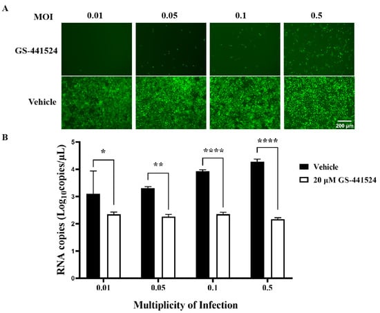 In order to investigate the inhibitory effect of GS-441524 on PEDV infection at high infection doses, Vero cells were infected with rPEDV-∆ORF3-GFP at MOI 0.01, 0.05, 0.1, and 0.5, respectively, and treated with 20 μM GS-441524 following the protocol designed to affect the viral replication phase (Figure 5A). With the increase of viral infection dose from 0.01 to 0.5, the ratio of GFP-positive cells gradually increased, while GS-441524 significantly inhibited the ratio of GFP-positive cells, even at an MOI of 0.5 (Figure 6A). Compared with the control groups, where the mRNA levels of M protein increased with the increase of infection dose, the mRNA levels of M protein in the drug treatment groups remained almost unchanged and were significantly lower than those in the control groups (Figure 6B). In addition, viral titers could not be detected in the supernatant of any of the drug-treated groups (data not presented), indicating that even at high viral infection doses, 20 μM GS-441524 can effectively inhibit the proliferation of PEDV.