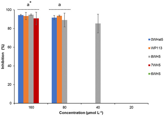 For ATCC 18804 (Figure 2), greater than 80% inhibition was attained when 20 µmol L−1 of the 0WHst5 was used. We observed inhibition above 80% for 8WH5 (40 µmol L−1), 7WH5 (80 µmol L−1) and 6WH5 (160 µmol L−1). It is important to note that at 80 µmol L−1, 6WH5 presented inhibition above 70%. Even though this inhibition is statistically different and smaller than the others, this is a result that reveals that this small fragment derived from Hst5 still maintains its antifungal activity.