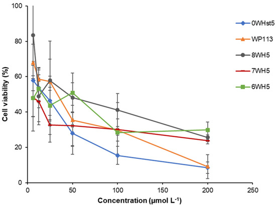 After incubation for only 2 h, it could be seen that for 0WHst5, at a concentration of 200 µmol L−1, there was a reduction of viable C. albicans cells to just 10%. This result agrees with Moffa et al., who demonstrated that there was no statistical difference in growth inhibition between treatments in the range of 800 µg mL−1 to 25 µg mL−1 [13].
