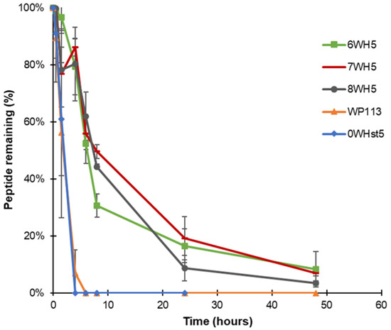 Quantification bands for the peptides 0WHst5, WP113, 8WH5, 7WH5 and 6WH5 remaining after withdrawal of aliquots at times 0, 0.5, 1.5, 4, 6, 8, 24 and 48 h. Bands were analyzed and quantified using Image Lab 6.1 software (Bio-Rad Inc., Hercules, CA, USA).