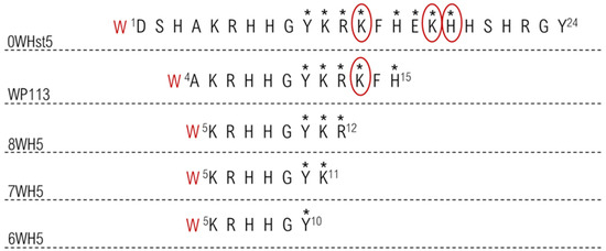 These results may be related to the cleavage sites present in 0WHst5 and its analogues. The image in Figure 7 highlights all proteolytic cleavage sites found for Hst5 [29] and proposed cleavage sites present in the analogue peptides, since they conserved part of the original Hst5 sequence. As demonstrated, there were eight cleavage points (shown by *) in the 0WHst5 amino acid chain; seven of these were present in the functional domain (Y10–H15) [29]. Peptide WP113 had only 12 amino acids present in the functional domain of 0WHst5 (A4–H15). These sites were most likely attacked by proteolytic enzymes, explaining its rapid degradation and similar profile to the original peptide. Furthermore, the amino acid K13 was described as a preferential cleavage site for proteolytic enzymes in saliva [29], which makes 0WHst5 and WP113 a target for proteolytic cleavage and degradation.