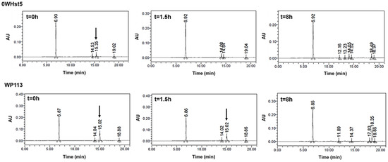 0WHst5 and WP113 degradation profile in human saliva. Aliquots of 100 µL were boiled and analyzed by HPLC after 0 h, 1.5 h and 8 h of incubation. Black arrows indicate intact 0WHst5 and WP113, retention time in 15.35 and 15.02 min, respectively.