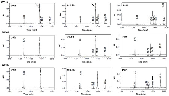 8WH5, 7WH5 and 6WH5 degradation profile in human saliva. Aliquots of 100 µL were boiled and analyzed by HPLC after 0 h, 1.5 h and 8 h of incubation. Black arrows indicate intact 8WH5, 7WH5 and 6WH5, retention time at 14.00, 13.99 and 14.61 min, respectively.