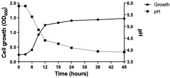 P. pentosaceus THG-219 exhibited unique growth dynamics during the cultivation process. After an initial period, the strain experienced a lag phase of approximately 6 h, indicating an adaptation phase characterized by limited proliferation. Subsequently, the strain entered an active exponential growth phase between 6 and 24 h post-inoculation, marked by a substantial increase in cell population under favorable conditions. At 48 h post-inoculation, the pH of the culture medium stabilized at 3.9 pH, serving as an important indicator of the strain’s metabolic activity and the prevailing environmental conditions within the medium. These findings provide valuable insights into the growth kinetics and pH homeostasis mechanisms of P. pentosaceus THG-219 and define its optimal growth conditions (Figure 1).