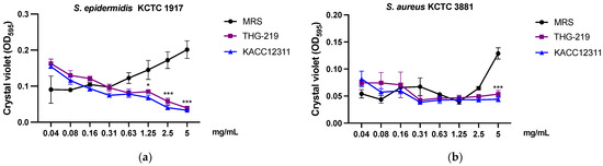 Anti-biofilm-formation activities of strain against P. pentosaceus THG-219 and KACC 12311 associated with (a) S. epidermidis KCTC 1917, (b) S. aureus KCTC 3881. Data are presented as mean ± SD of the result in three replicates. *, p < 0.05, ***, p < 0.001 compared to control.
