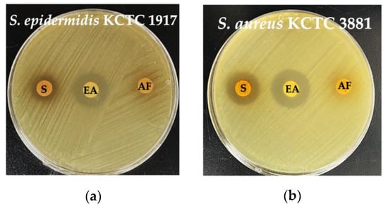 Antibacterial activity of THG-219 CFS and its EA fractions by disk diffusion assay. (a) Inhibition zone bar graph of CFS and EA against S. epidermidis KCTC 1917; (b) Inhibition zone bar graph of CFS and EA against S. aureus KCTC 3881. S: THG-219 CFS; EA: EA fraction of the THG-219 supernatant; AF: aqueous fraction (insoluble in ethyl acetate).