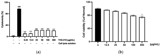 As shown in Figure 5, cytotoxicity tests of THG-219 CFS were conducted on Caco-2 cells using the Dyne LDH PLUS Cytotoxicity Assay Kit (Dynebio Inc., Seoul, Republic of Korea) and on HaCaT cells using the MTT assay (Sigma-Aldrich, St. Louis, MO, USA). When treated with 500 μg/mL, no cytotoxicity was observed in Caco-2 cells, as shown in Figure 5a. However, in HaCaT cells (Figure 5b), cytotoxic effects were evident at the highest concentration (500 μg/mL), while no significant cytotoxicity was detected at concentrations up to 100 μg/mL. These findings suggest that 100 μg/mL may serve as a suitable maximum concentration for future in vitro studies.