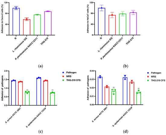 Cell adhesion ability of THG-219 and its inhibitory effects on pathogen adhesion. (a) Adhesion of THG-219 to Caco-2 cells; (b) Adhesion of THG-219 to HaCaT cells; (c) Inhibitory effects of THG-219 on the adhesion of S. epidermidis KCTC 1917 and S. aureus KCTC 3881 to Caco-2 cells; (d) Inhibitory effects of THG-219 on the adhesion of S. epidermidis KCTC 1917 and S. aureus KCTC 3881 to HaCaT cells. Data are presented as mean ± SD of the result in three replicates. **, p < 0.01 compared to the control group.