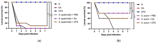 The in vivo toxicity and antimicrobial efficacy of THG-219 against S. aureus and S. epidermidis were evaluated using the Galleria mellonella larval model. Larvae (200–240 mg) were injected with 10 μL of S. aureus or S. epidermidis (106 CFU/mL) into the left proleg [25]. After 6 h, 10 μL of CFS or EA of THG-219 (0.006 mg/mL) was injected. PBS (10 μL) was used as a negative control. Four larvae were used per condition, and experiments were repeated three times. Survival was monitored over 96 h at 37 °C, and death was defined as the absence of movement in response to gentle stimulation.