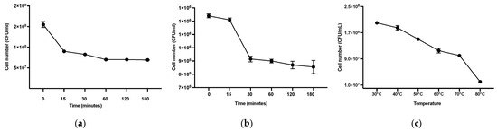 To determine thermal stability, THG-219 cultures suspended in phosphate-buffered saline (PBS) were subjected to heat exposure at incremental temperatures (30 °C, 40 °C, 50 °C, 60 °C, 70 °C, and 80 °C) for a duration of 30 min each. Following the thermal challenge, the samples underwent serial dilution and were plated onto MRS agar. The inoculated plates were incubated at 37 °C for 48 h, after which colony counts were performed to evaluate bacterial survival at each temperature [28].