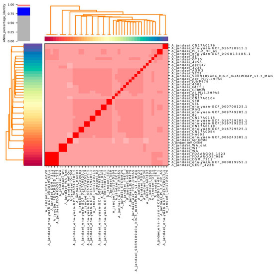 All the 48 A. jandaei genomes available at the public genome repository of the National Center for Biotechnology (NCBI) [23] were acquired in .fna files to complete this study database on 5 August 2024. All genomes were classified by strain, size (mb), assembly, and host/isolation source (Table 1).