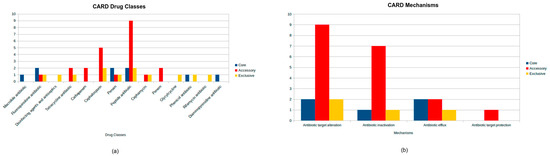 CARD database antimicrobial resistance analysis in Aeromonas jandaei, showing the distribution of drug classes (a) and antimicrobial resistance mechanisms (b), highlighting the number of genes belonging to core, accessory, and exclusive genomes.
