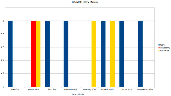 The analysis of resistance to heavy metals revealed five significant genes: two in the core genome and one in the accessory genome, as detailed in Table 5, along with two exclusive genes (arsA and recG) found in other genomes beyond the Brazilian samples. The core genome genes include the ruvB gene, which encodes an ATP-dependent DNA helicase from the Holliday junction and is associated with resistance to chromium (Cr), and the divalent cation transporter mntH/yfeP, which shows resistance to multiple metals, including manganese (Mn), iron (Fe), cadmium (Cd), cobalt (Co), and zinc (Zn). The arsC gene, an accessory gene, encodes the ArsC protein and is specifically related to resistance to arsenic (As). The distribution of heavy metal resistance genes is illustrated in Figure 4. Supplementary Figure S4 illustrates the distribution of genes across all strains, revealing that the majority of lineages, including the strains from this work, do not have accessory genes.