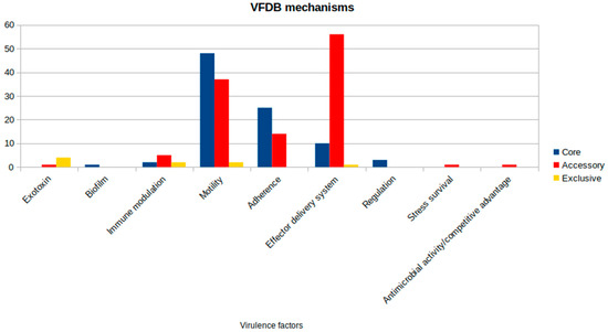 The isolates analyzed also exhibited a gene complex composed of flg and flr genes, which are linked to flagellar biosynthesis [59,60]. The importance of flagella for motility in the environment is mainly relevant for free-living pathogens, allowing them to migrate to a more suitable location and enhance surface contact, making this adaptation a significant evolutionary acquisition [59].