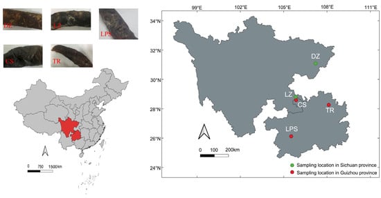 A total of five smoke-cured sausage samples were collected in March 2022. Two samples (labeled DZ and LZ) originated from Dazhou (107.2° E, 31.1° N) and Luzhou (105.8° E, 28.8° N) in Sichuan Province. The three remaining samples—CS, LPS, and TR—were collected from Chishui (105.9° E, 28.6° N), Liupanshui (105.5° E, 26.1° N), and Tongren (108.1° E, 28.3° N) in Guizhou Province, respectively. The geographical locations of the sampling sites are illustrated in Figure 1. All samples were stored in an ice box and transported to the laboratory within 24 h. Subsequently, the sausages were frozen at −20 °C for physicochemical parameter detection and microbial community profiling.