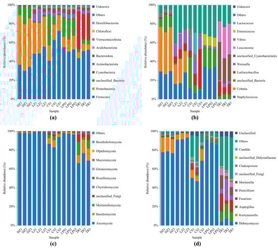 Abundance analysis of bacteria (a,b) and fungi (c,d) obtained from five sausage samples at the phylum level and genus level. DZ: Dazhou; LZ: Luzhou; CS: Chishui; LPS: Liupanshui; TR: Tongren. These five sausage samples were measured in triplicate.