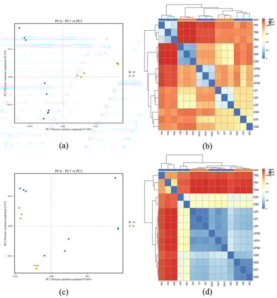 Principal component analysis (PCA) (a,c) and heatmap plot (b,d) display Bray–Curtis dissimilarity. Red and blue colors in PCA plot denote SC (Sichuan) and GZ (Guizhou) sausages, respectively. Blue indicates high similarity (low distance), and red indicates low similarity (high distance) between microbial communities of sausage samples.