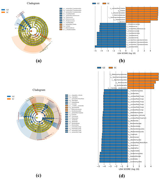 LEfSe analysis of bacteria (a,b) and fungi (c,d) of two sausage groups. Groups SC and GZ with red and blue colors represent Sichuan and Guizhou sausage samples, respectively.