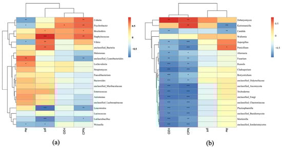 Correlation analysis between physiochemical parameters and dominant bacteria (a) and fungi (b) from five sausage samples based on Spearman’s algorithm. “*”, “**”, “***” denote significances at the p = 0.05, p = 0.01, p = 0.001 levels, respectively.