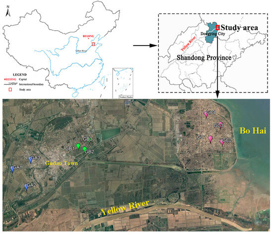 PAH-contaminated soils from decommissioned well sites of the Shengli Oilfield in the YRD were sampled to investigate aging characteristics under a natural revegetation process. On 29 September 2023, we selected 20 sampling sites and collected 40 soil samples (0~20 cm depth) from both vegetated and bare land at closed, abandoned wells in this area (Figure 1, Table S1). Two samples of bare soil and two samples of vegetated soil were collected, respectively, at 10 sites. One sample was used for the determination of soil properties and the other for the determination of microbial communities. As the distance between the sampling site and coastline decreased, the sampling regions were sequentially termed GA, GB, and GC; from these sites, 3 groups of soil samples with a gradient of soil salinity were obtained, while samples of bare soil were assigned as GAB, GBB, and GCB and samples of vegetated soil were coded as GAV, GBV, and GCV. The vegetation community in the vegetated soil of the sampling area was predominantly composed of Phragmites australis, Suaeda heteroptera, and Tamarix chinensis. Three sub-samples were collected at each sampling point as parallel samples using a stainless-steel shovel and then uniformly mixed with equal amounts. All samples were collected away from obvious tar blocks and crude oil spillage. During the transport process to the laboratory, soil samples were stored in sterilized plastic tubes at −20 °C. In the laboratory, each sample was divided into two portions. One portion was freeze-dried and finely ground (passing through a 2 mm sieve) for determinations of PAHs and physiochemical properties, and the other was stored at −80 °C, preparing for DNA extraction and molecular microbiological analysis.