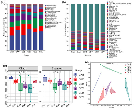 To determine the effects of vegetation and soil salinity on soil bacterial communities, the NMDS analysis was applied based on the Bray–Curtis distance matrix method (Figure 2d). Among the sampling regions with different soil salinity and vegetation conditions, the structure of bacterial communities shifted considerably. Although soils from different sampling regions showed a gradient of soil salinity, samples of vegetated soils (GAV, GBV, and GCV) were clustered together and separated from samples of bare soils. When comparing regions, GAV and GAB were the most similar, with the lowest soil salinity among study regions.
